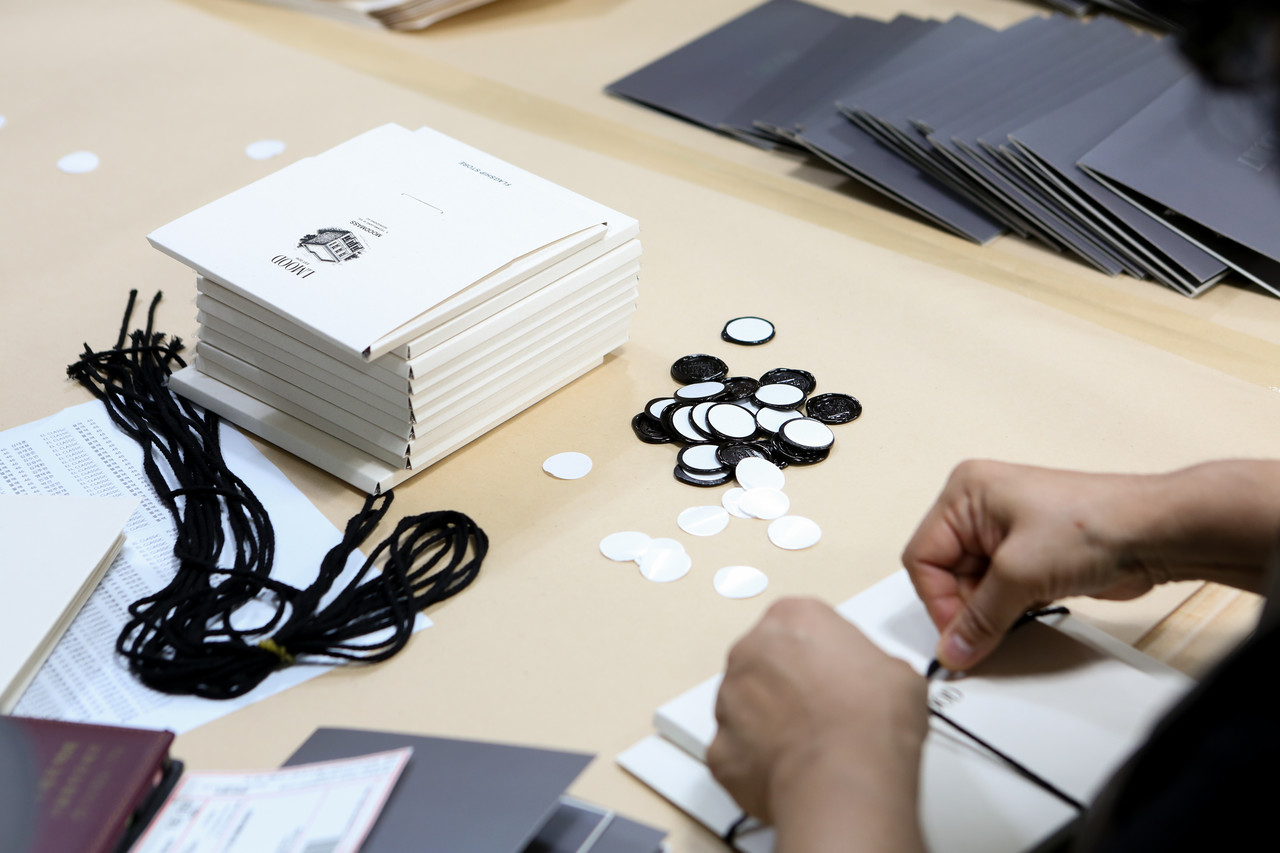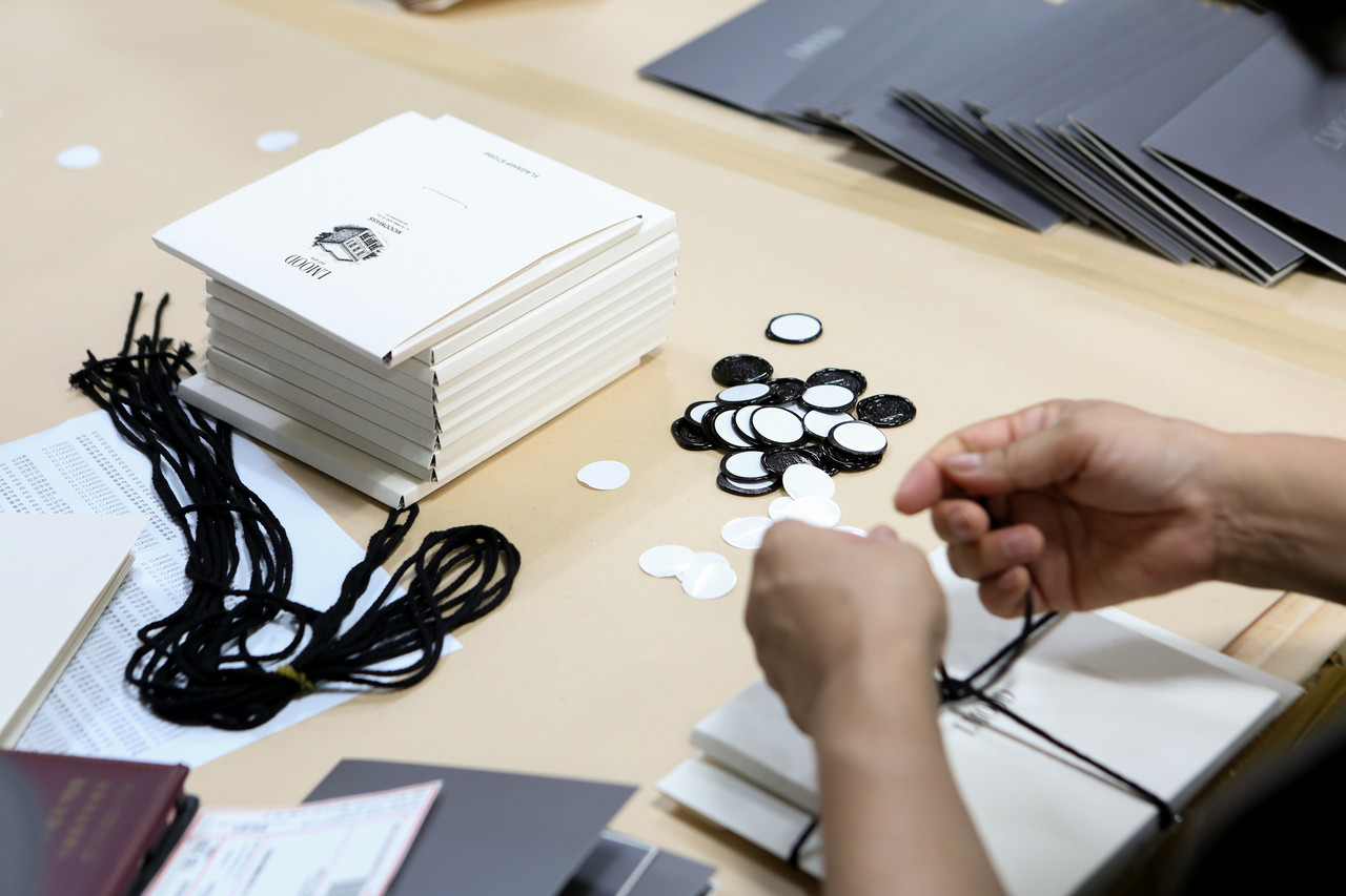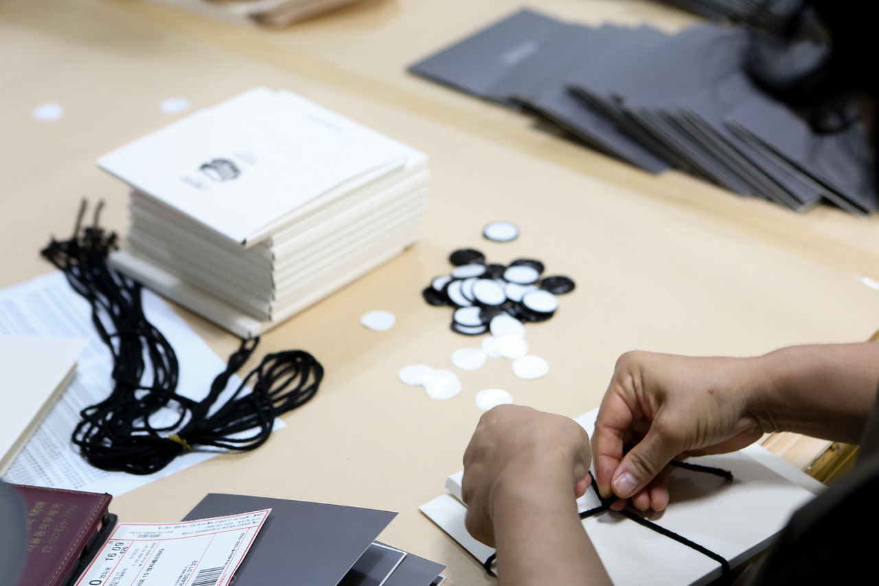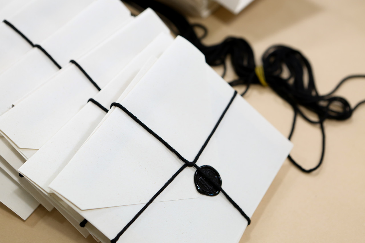 봉투와 박스를 한꺼번에 끈으로 묶어 발송까지 진행하였습니다.