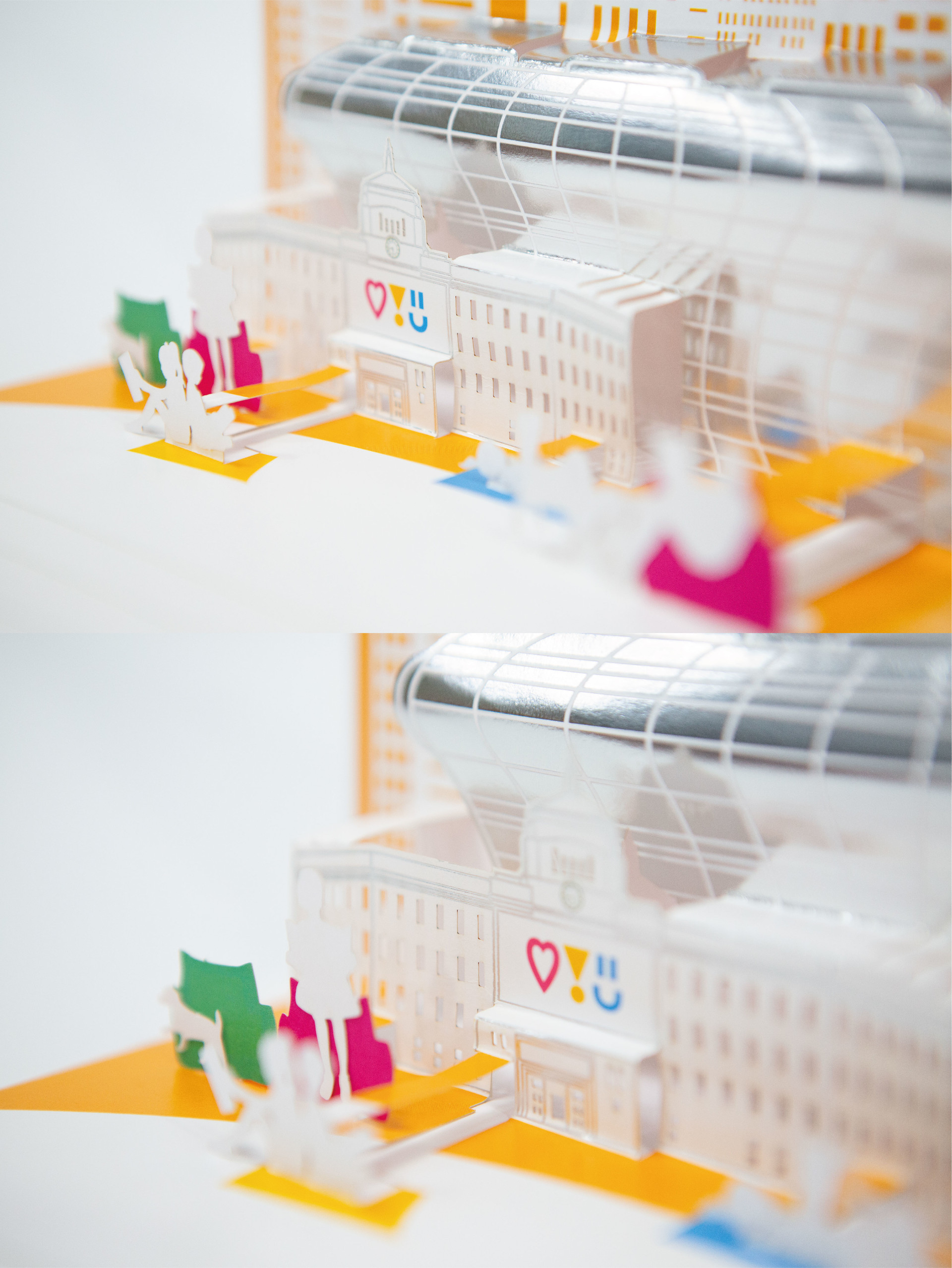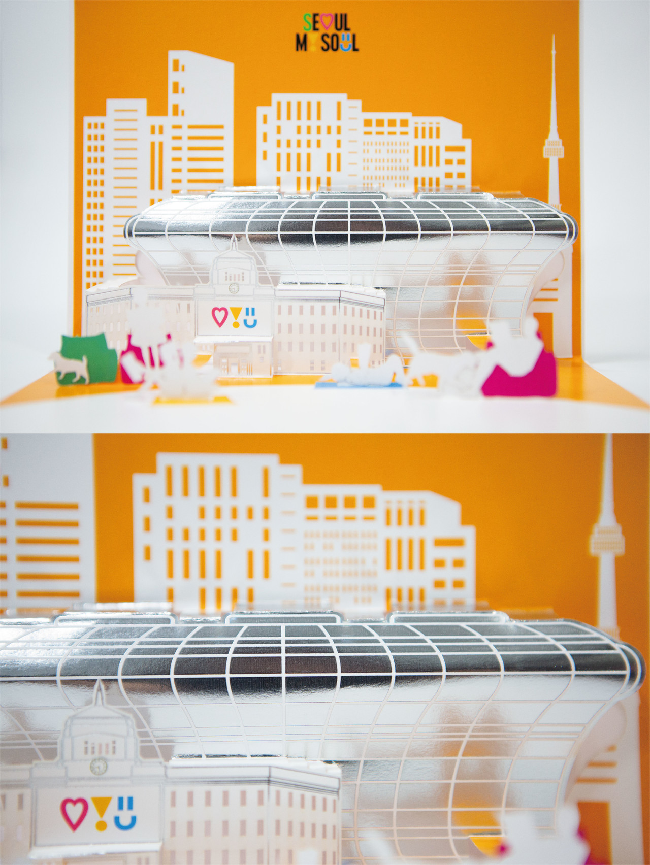 서울신청사는 은박 가공을 적용해 빛나는 질감과 현대적인 신축 건축의 이미지를 강조했으며, 실제 공간의 전후 관계를 기준으로 서울시청 일대의 상징적인 건축 구성을 구조적으로 표현하였습니다.